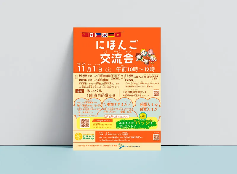 アイテム: 交流会告知用A4表面チラシ、公共施設への設置、SNSでも掲載予定