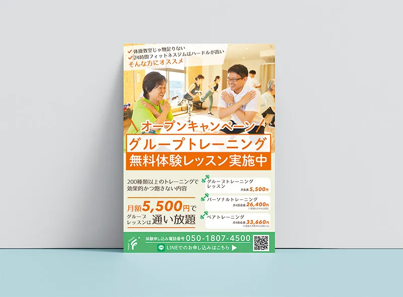 店舗情報拡散用トレーニングジムポスターを作成しました! 2025-11-17 | flyer 名前: 店舗情報拡散用トレーニングジムポスターアイテム: 店舗前設置用A1ポスターご希望: 緑系希望。対象年齢。40歳以上の体操教室では物足りない活発な女性。デザインのポイント:グループトレーニングレッスン無料体験レッスン実施中が目に飛び込んでくるようなデザインになっています。お悩みの部分もわかりやすく、斜めに配置することによって目立つようになっています。緑は少なめですが文字の見やすさを重視しました。制作時期:2023.11月