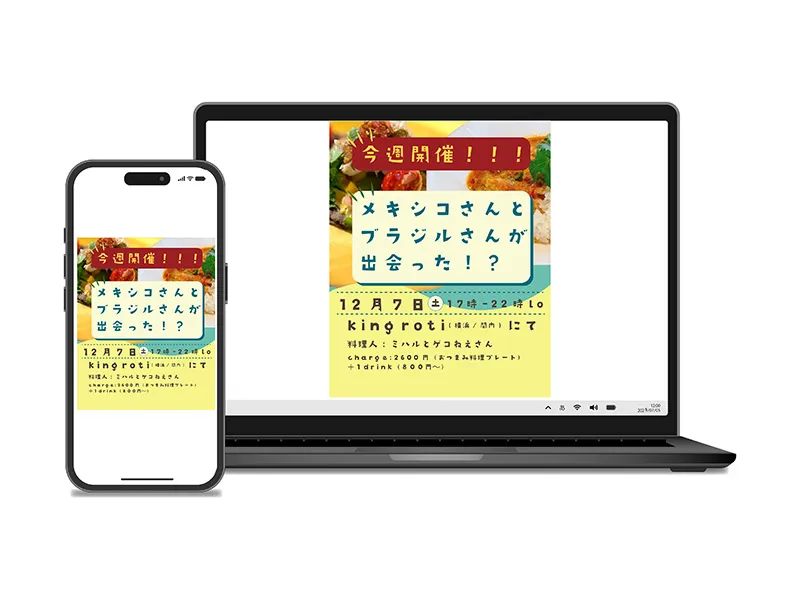 料理イベント告知インスタバナーを作成しました! 2025-11-17 | web 画像 名前:料理イベント告知インスタバナーアイテム: インスタのバナーデザインご希望:柔らかい色味を使用して欲しい。デザインのポイント:メキシコとブラジル共通の海を連想させる曲線をしようして、デザイン。日程、時間、場所が一目でわかるような色とフォントを使用。制作時期:2024.11月
