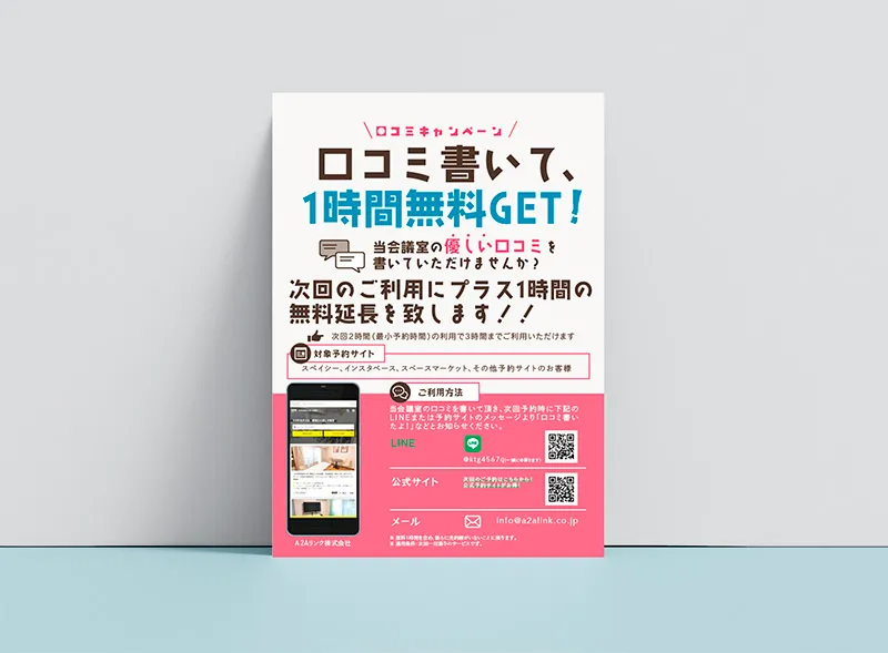 ご希望:予約サイトの利用からスペースに訪れたお客様向けに、リピーターを自社サイトへQRコードから誘導するレンタルスペース貼り出し用チラシを作成して欲しい。ポップな雰囲気を希望。色は薄色ピンク系を希望。