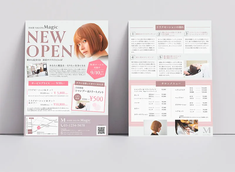 20代から40代女性対象サロンオープニング告知チラシを作成しました。 2025-11-17 | flyer 名前: 20代から40代女性対象サロンオープニング告知チラシアイテム: A4 表裏チラシデザインご希望: 都会に住む20代から40代のオシャレな女性。デザインのポイント:流行りの髪色、グレージュを使用。情報はわかりやすく四角くまとめ、ナンバリングしています。オープン情報はできるだけ大きく書き、オープニングキャンペーンは目立つように斜めに設置しています。制作時期:2023.5月