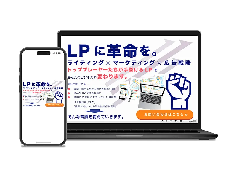 LP制作会社、LP革命LP REVO LPのファーストビューを作りました! 2025-11-17 | LP 名前: LP制作会社、LP革命,LP REVO LPのファーストビューアイテム: LPのファーストビューご希望:LP制作会社を探している人の目に飛び込んでくるデザインで。デザインのポイント:上昇を表す右肩上がりの矢印をあしらい、さらに力強く上昇するイメージを強めるために握り拳の画像を付け加えました。制作時期:2024.7月